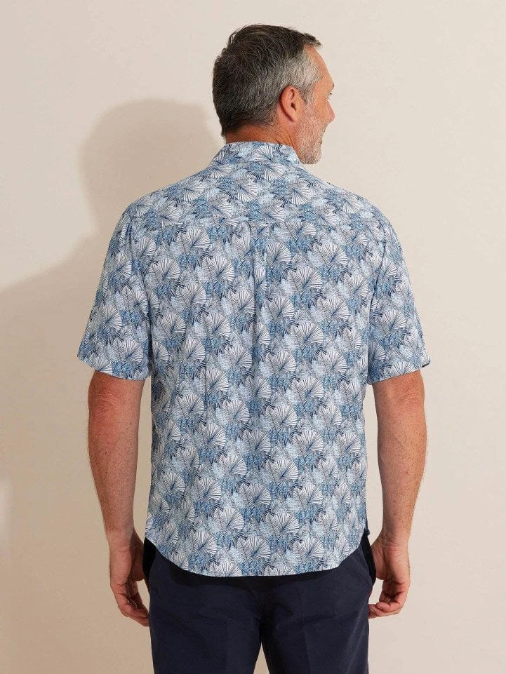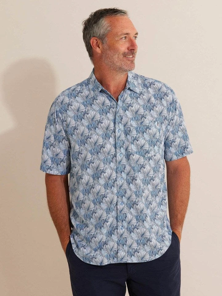 Harlem! This subtle leaf print check in coastal shades of blue utilises the cool drapability of bamboo with an effortlessly breezy summer print.