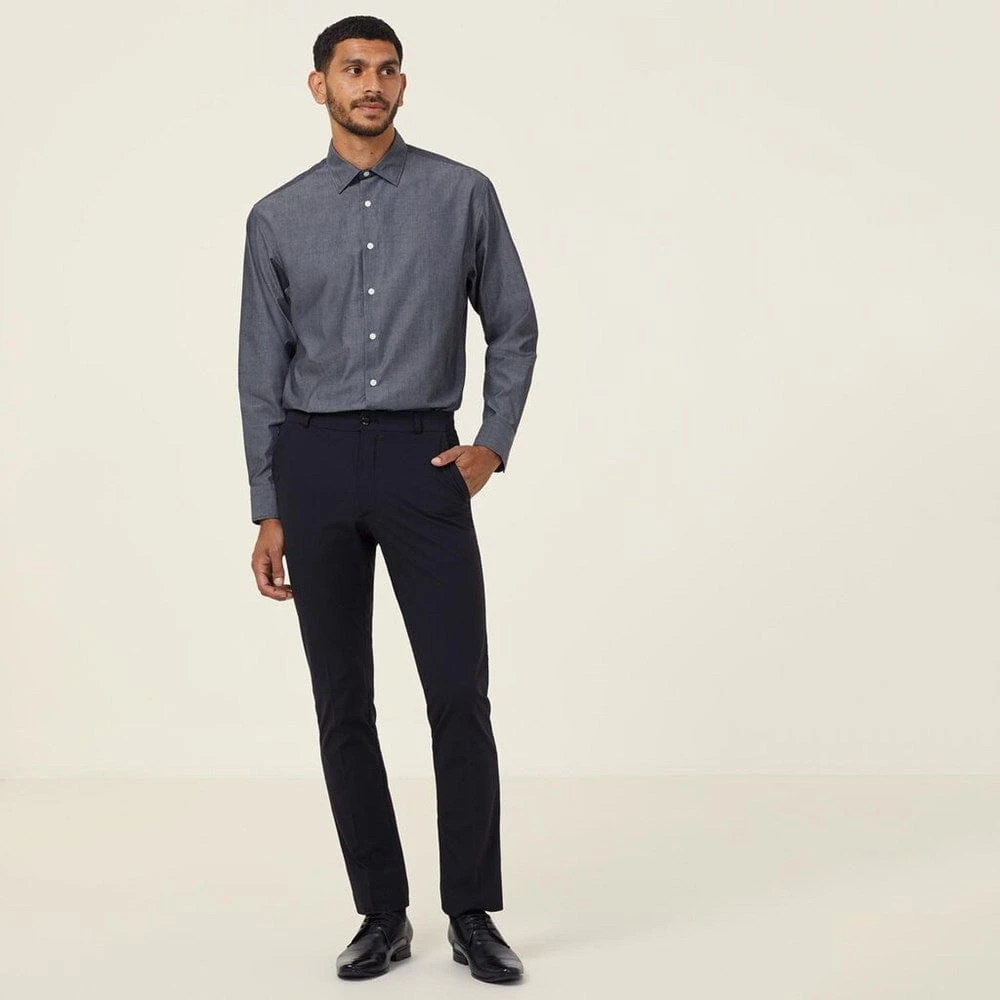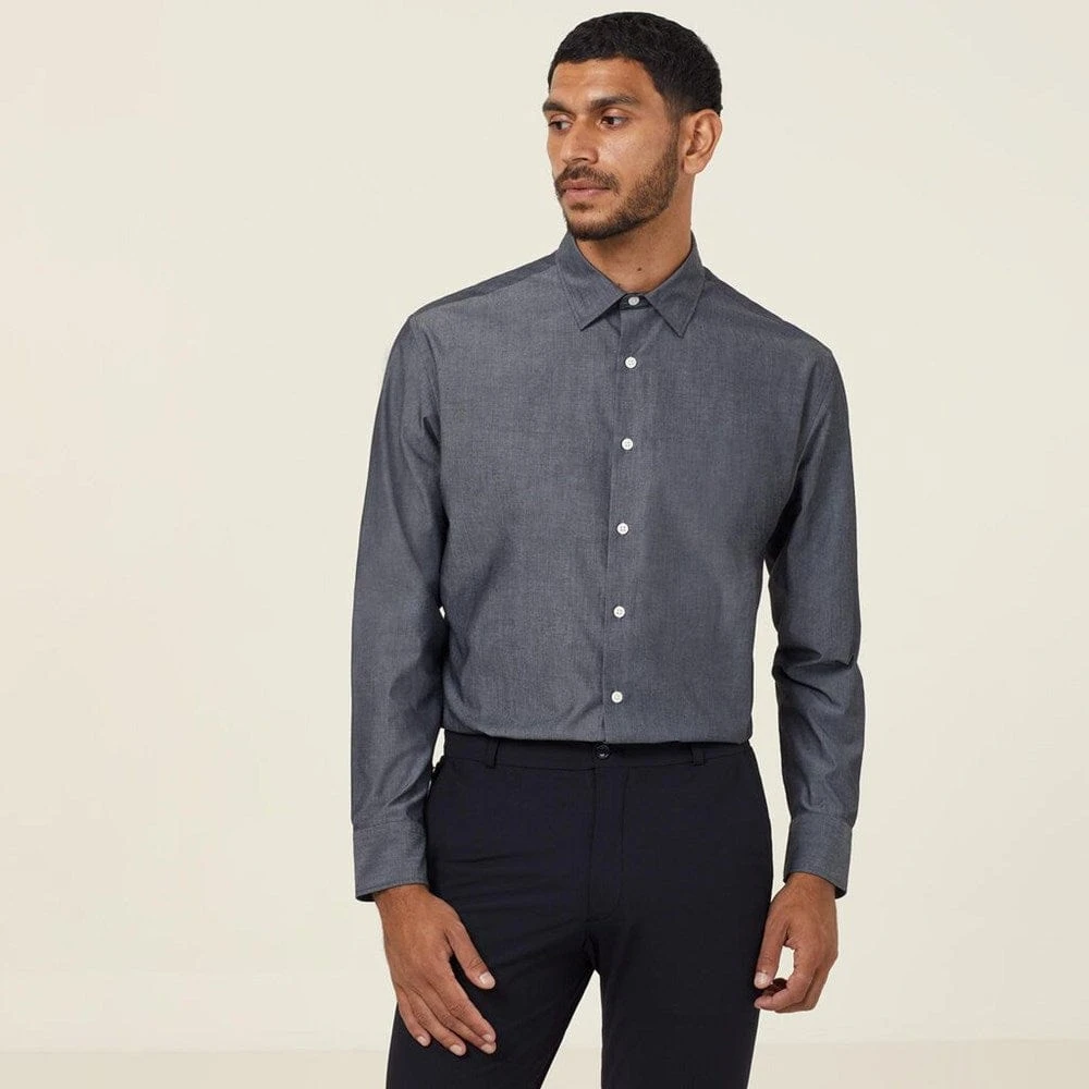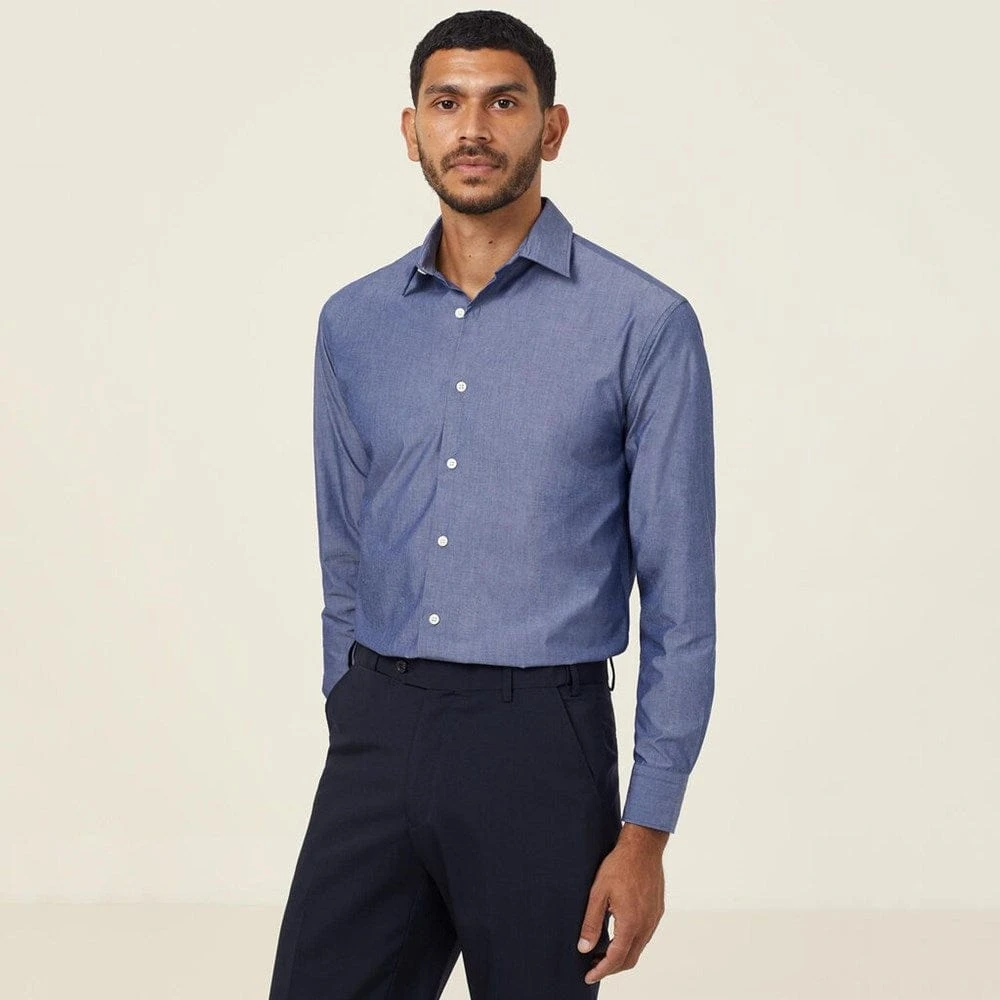 The classic chambray button down is a wardrobe essential for very good reason, and our Long Sleeve Chambray Shirt is a compelling case in point. With its modern slimline collar and double button cuff, it will deliver effortless cool to your workday uniform. The box pleat at the back ensures ease of movement, while the cotton-rich chambray fabric offers a textured denim look that’s exceptionally easy to care for. Cuff the sleeves for a more relaxed look.