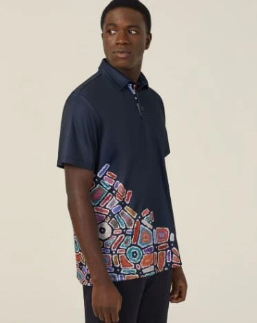 Adorned with remarkable artwork, the Water Dreaming Polo is an essential piece for your workwear wardrobe. This smart, fitted silhouette features an intricate design by Indigenous artist, Lynette Nangala Singleton, entitled Ngapa Jukurrpa (Water Dreaming) on a midnight blue backdrop. Highlighting both the front and back panels and the inner button placket, the digital print offers exceptional colourfastness to ensure it remains bright and sharp, wash after wash. You’ll love wearing this truly special piece.