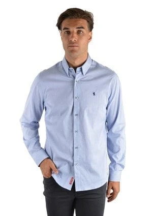 Tailored fit style, stretch for comfort and movement, contrast chambray facing on inside collar stand, internal neck stripe taping, concealed collar peak buttons,