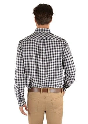 Medium scale yarn dyed check, countryman pockets with pen holder, long shirt tail, back pleat for comfort, concealed collar peak buttons, removable collar stays, horseman embroidery on chest pocket