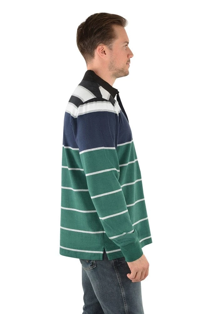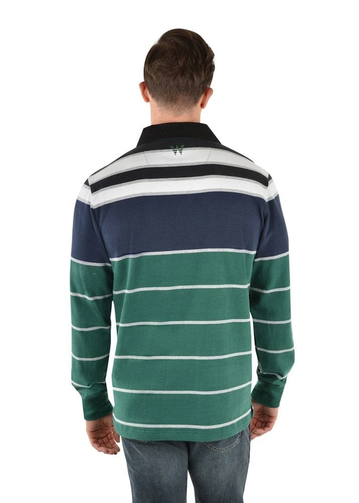 Heavyweight jersey knit rugby, Wrangler iconic logo chest embroidery, concealed buttons on centre front placket, cotton drill collar with contrast underside, herringbone tape on inside side seam splits, rib trim cuffs